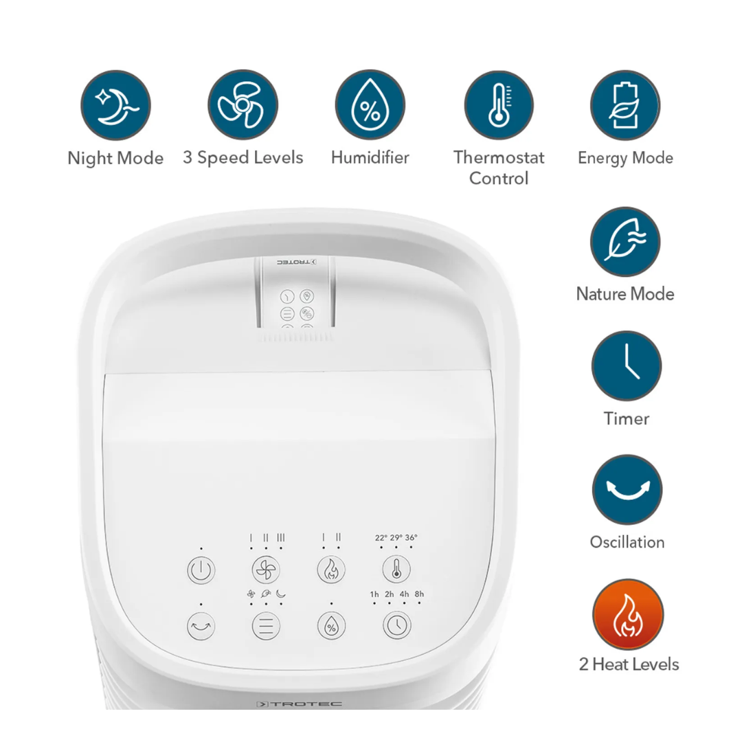 Šis prietaisas taip pat veikia kaip oro drėkintuvas, kuris padeda palaikyti sveiką oro drėgnumą ir stiprina organizmo imuninę apsaugą. Trotec PAE 19 H gali būti naudojamas kaip ventiliatorius su trimis greičio lygiais, o svyravimo režimas užtikrina tolygų oro paskirstymą patalpoje.