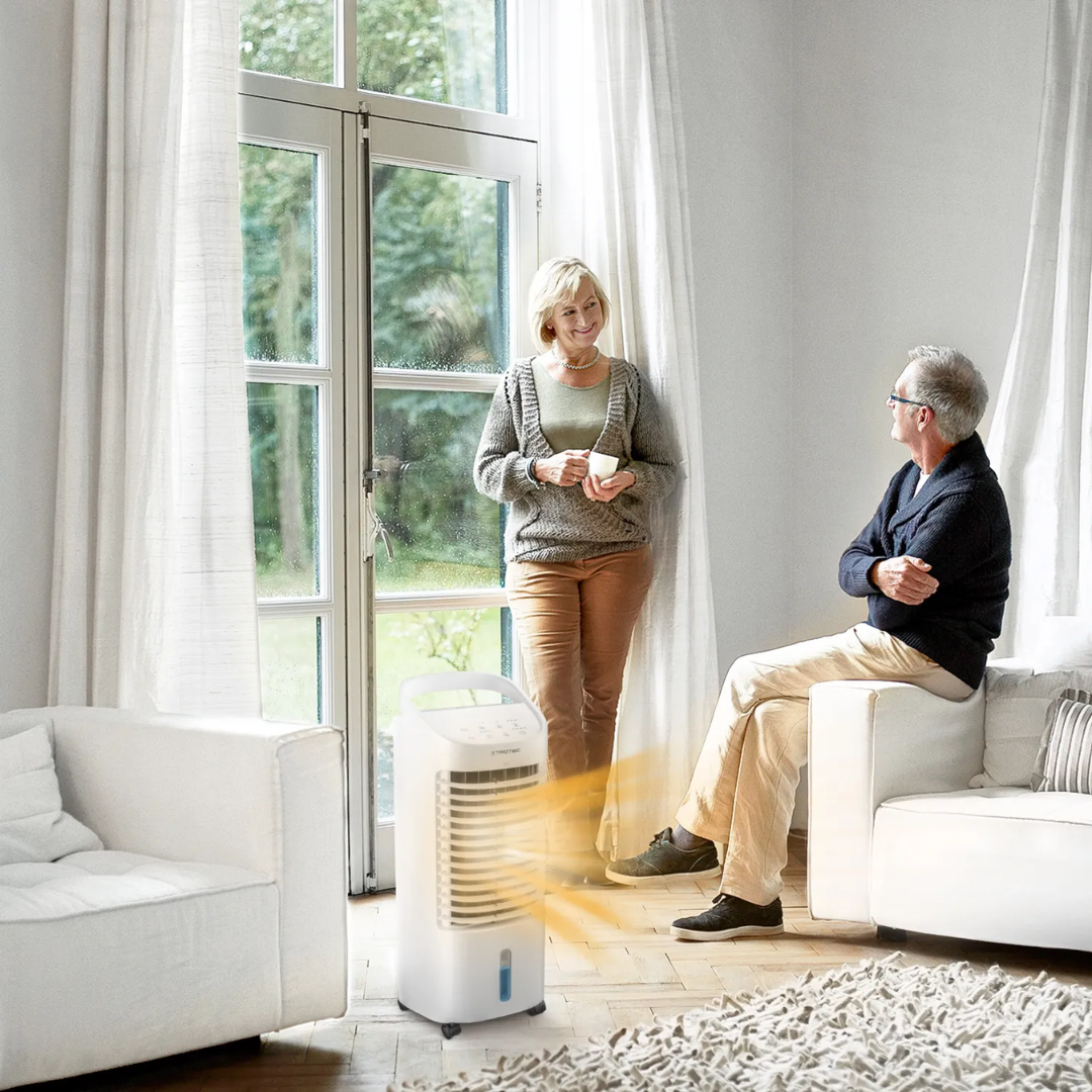Oro vėsintuvas, šildytuvas, drėkintuvas ir ventiliatorius Trotec PAE 19 H - tai universalus prietaisas, skirtas optimizuoti patalpų klimatą ištisus metus. Šis įrenginys puikiai tinka tiek vasarą, tiek žiemą, užtikrindamas komfortišką temperatūrą ir oro kokybę. Naudojant naujovišką korio technologiją, Trotec PAE 19 H natūraliai ir efektyviai vėsina orą, o šildymo funkcija su dviem lygiais (1400W ir 2000W) leidžia greitai sušildyti patalpas. Integruotas termostatas padeda taupyti energiją, automatiškai išjungdamas kaitinimo elementą, kai pasiekiama nustatyta temperatūra.