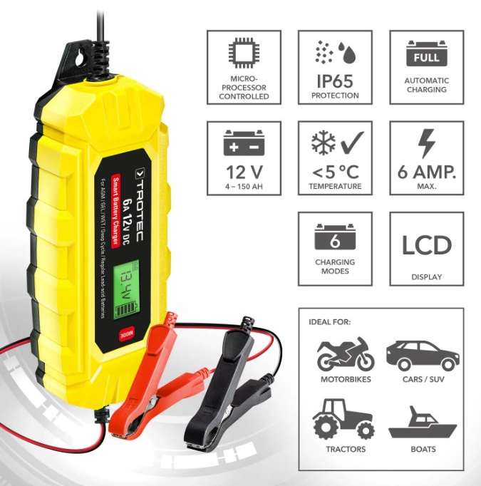 - Universalus akumuliatoriaus pakrovėjas Trotec PBCS 6A su LCD ekranu yra skirtas 12 V akumuliatorių įkrovimui ir priežiūrai, tinkantis automobiliams, visureigiams, motociklams, traktoriams ir motorinėms valtims.