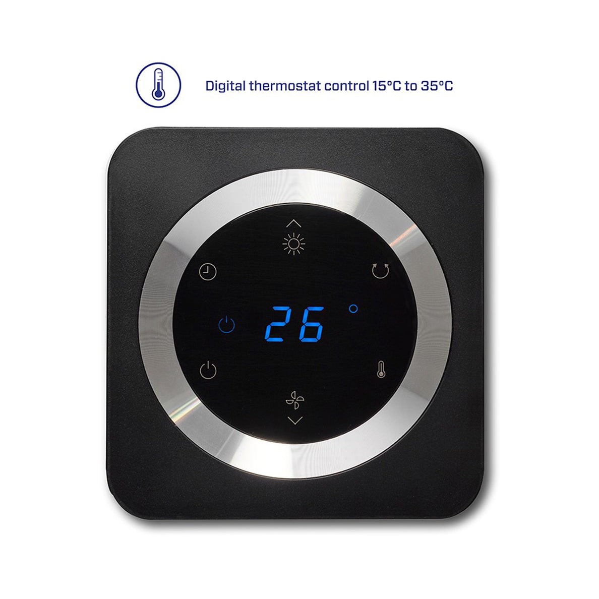 Valdymas yra paprastas ir patogus su skaitmeniniu ekranu, kuriame yra šeši jutikliniai mygtukai, leidžiantys lengvai pasirinkti norimus nustatymus. Be to, ventiliatorius-šildytuvas turi nuotolinio valdymo pultą.