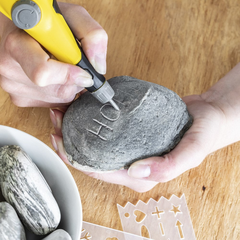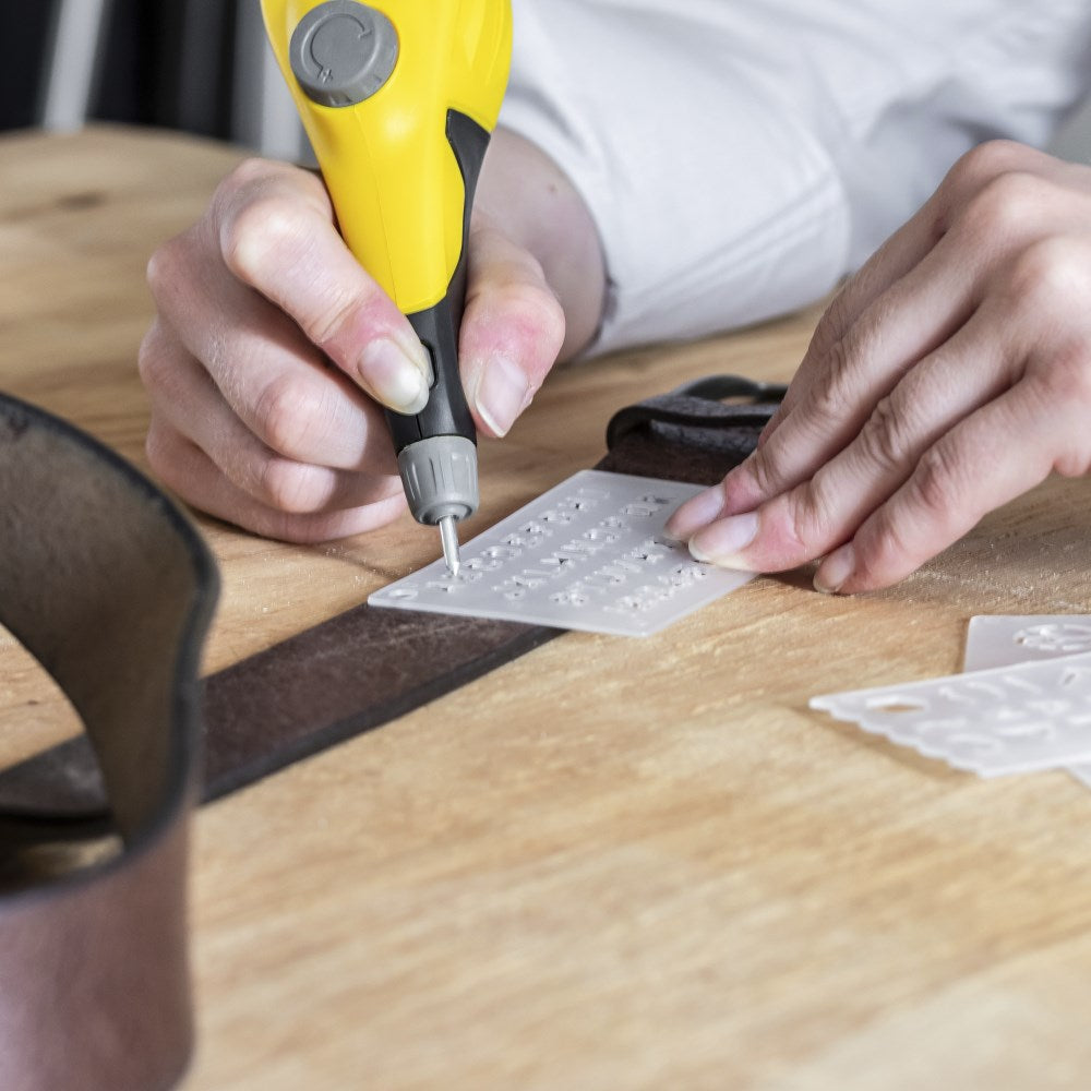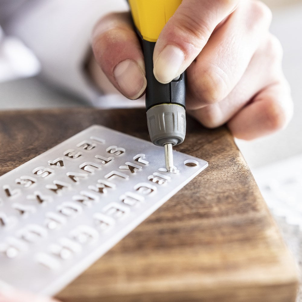 - Į komplektą įeina 4 praktiški graviravimo trafaretai su raidėmis, skaičiais bei dekoratyviniais simboliais, leidžiantys iškart pradėti darbą.