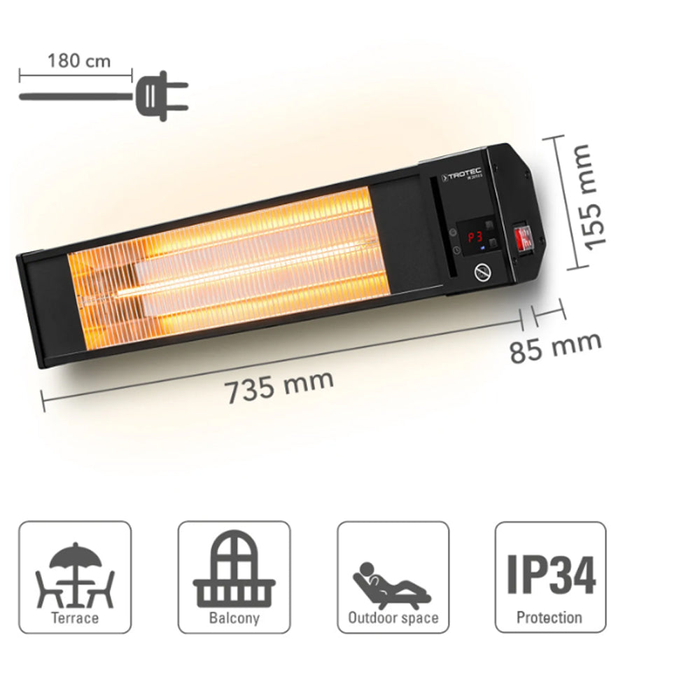 - Infraraudonųjų spindulių šildytuvas Trotec IR 2010 S yra puikus pasirinkimas tiems, kurie nori mėgautis šiluma lauke visus metus. Šis šildytuvas pasižymi iki 2000 W infraraudonųjų spindulių šilumos galia ir turi nuotolinio valdymo pultą, sumažintą šviesos spinduliuotę bei 3 šildymo lygius.
