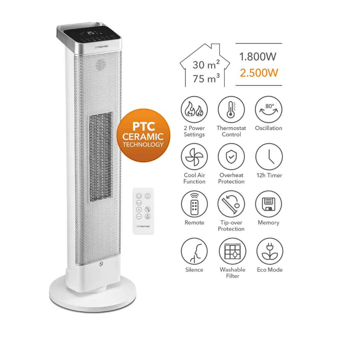 Keraminis šildytuvas Trotec TFC 25 E pasižymi energiją taupančiu šildymo valdymu su pritaikyta šildymo galia. Įmontuotas termostato valdymas, du šildymo lygiai (1800 W ir 2500 W) ir tikslus temperatūros reguliavimas leidžia efektyviai šildyti patalpas iki 30 m² / 75 m³ dydžio. Pasiekus nustatytą temperatūrą, ventiliatorius išsijungia, taupydamas energiją. Šildytuvas taip pat gali būti naudojamas apsaugoti nešildomas patalpas nuo per didelio atšalimo.