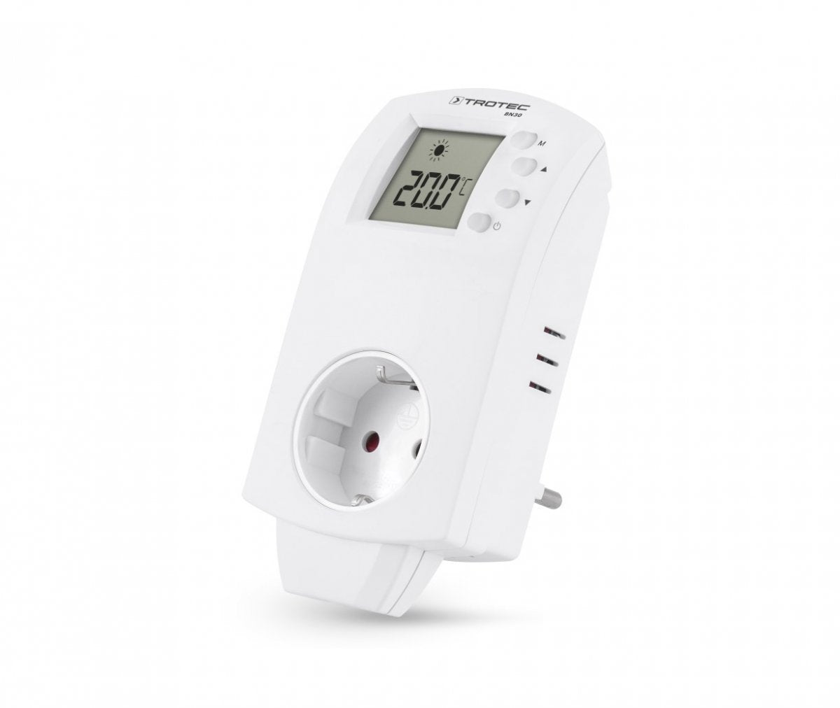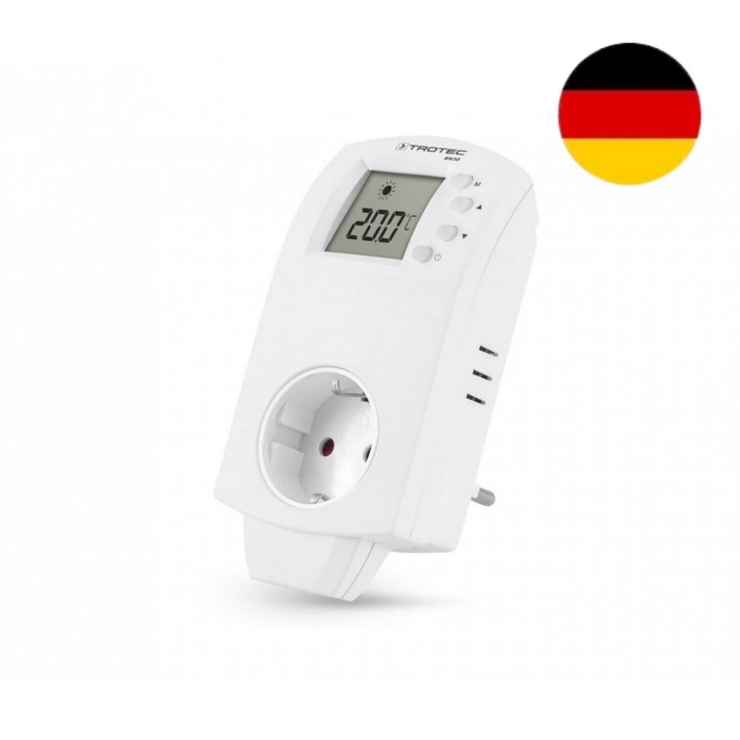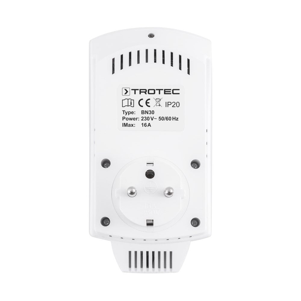 Kištukinis neprogramuojamas termostatas Trotec BN30 yra puikus pasirinkimas šildymo ir kondicionavimo prietaisų temperatūros valdymui nuo 5 °C iki 30 °C. Šį termostatą paprasta naudoti: tiesiog įkiškite jį į elektros lizdą, o šildymo ar kondicionavimo įrenginį prijunkite prie termostato. Trotec BN30 matuoja kambario temperatūrą naudodamas integruotus jutiklius ir reguliuoja prijungtus prietaisus pagal nustatytą temperatūrą. Jutikliai kas 10 sekundžių tiksliai matuoja temperatūrą, o platus LCD ekranas rodo esamą kambario temperatūrą. Net ir dingus elektrai, nustatyti parametrai yra išsaugomi, nes įrenginys turi integruotą EEPROM atmintį. Dėl kištukinio tipo konstrukcijos šis termostatas nereikalauja įmontavimo į sieną, todėl yra lengvai naudojamas ir efektyvus.