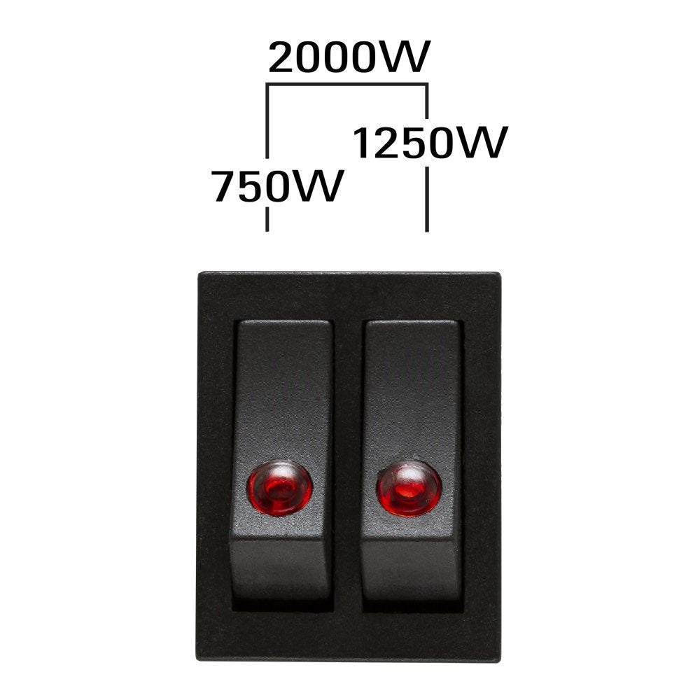 - Trys šildymo lygiai, valdomi dviem jungikliais: 750 W, 1.250 W ir 2.000 W.