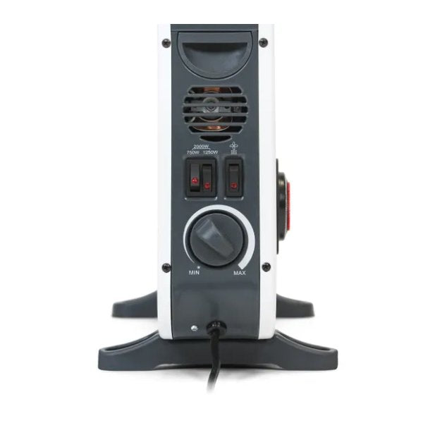 - Trys šildymo lygiai: 750 W, 1250 W arba 2000 W;