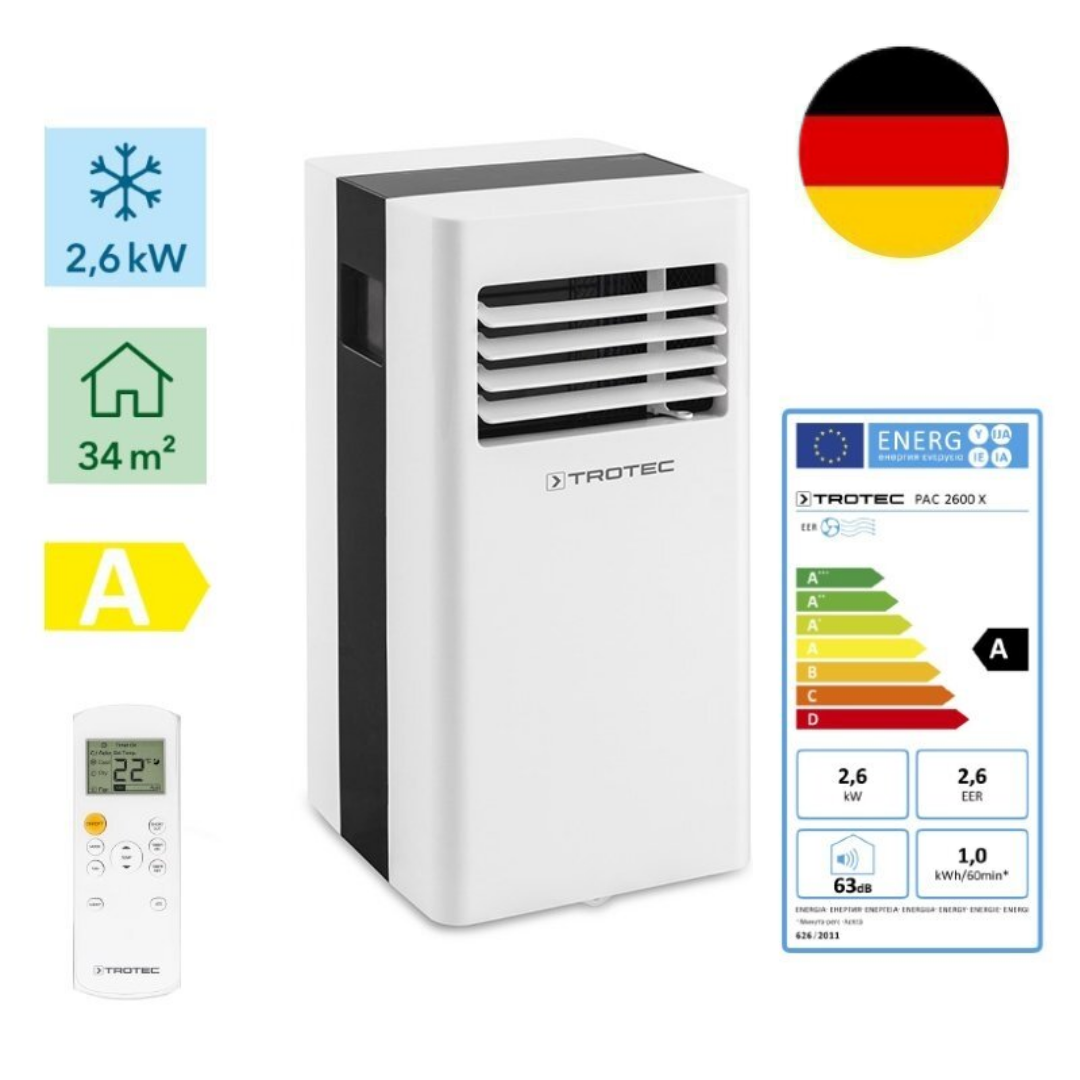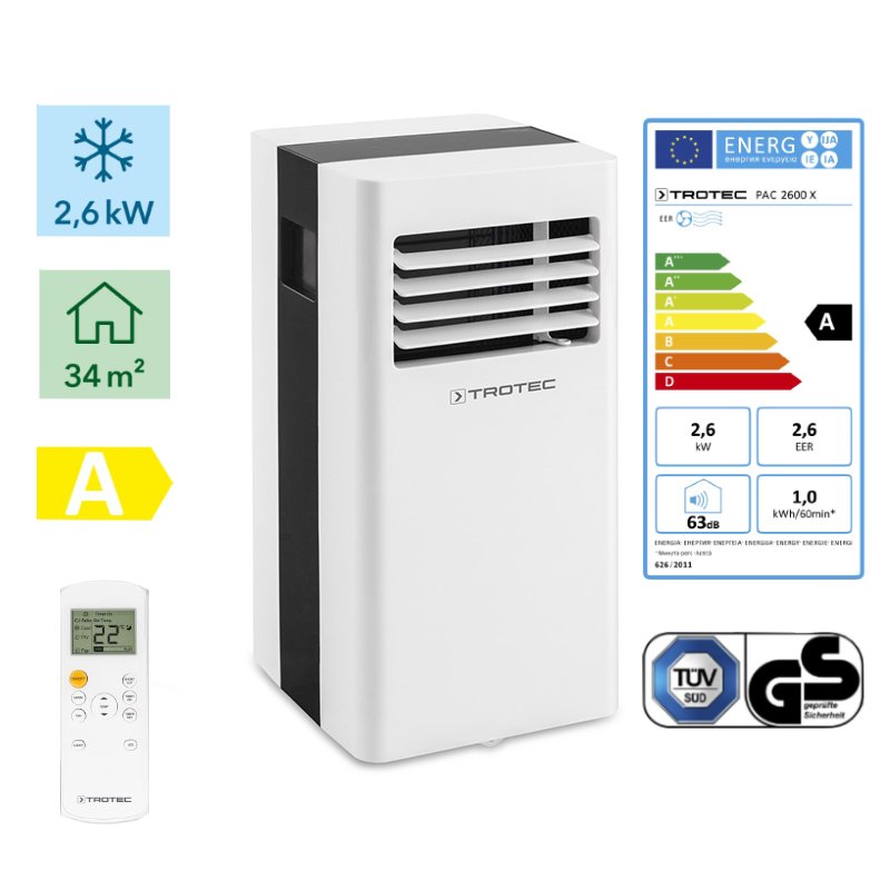 Mobilus oro kondicionierius Trotec PAC 2600 X yra universalus „3 in 1“ įrenginys, kuris užtikrina malonų kambario klimatą vėsinant, vėdinant bei sausinant orą. Šis kondicionierius greitai ir efektyviai vėsina patalpas karštomis vasaros dienomis, leidžiant mėgautis atvėsinta 17-35°C temperatūra, sunaudojant tik 2,6 kW elektros energijos. Idealiai tinka naudoti namuose, biuruose, verslo patalpose, sodo nameliuose, viešbučiuose ar restoranuose, kurių plotas yra iki 34 m² arba 85 m³. Įrenginys pasižymi ekonomišku veikimu – vėsinimo funkcija automatiškai išsijungia, kai pasiekiama nustatyta temperatūra, taip sumažinant elektros energijos sąnaudas.