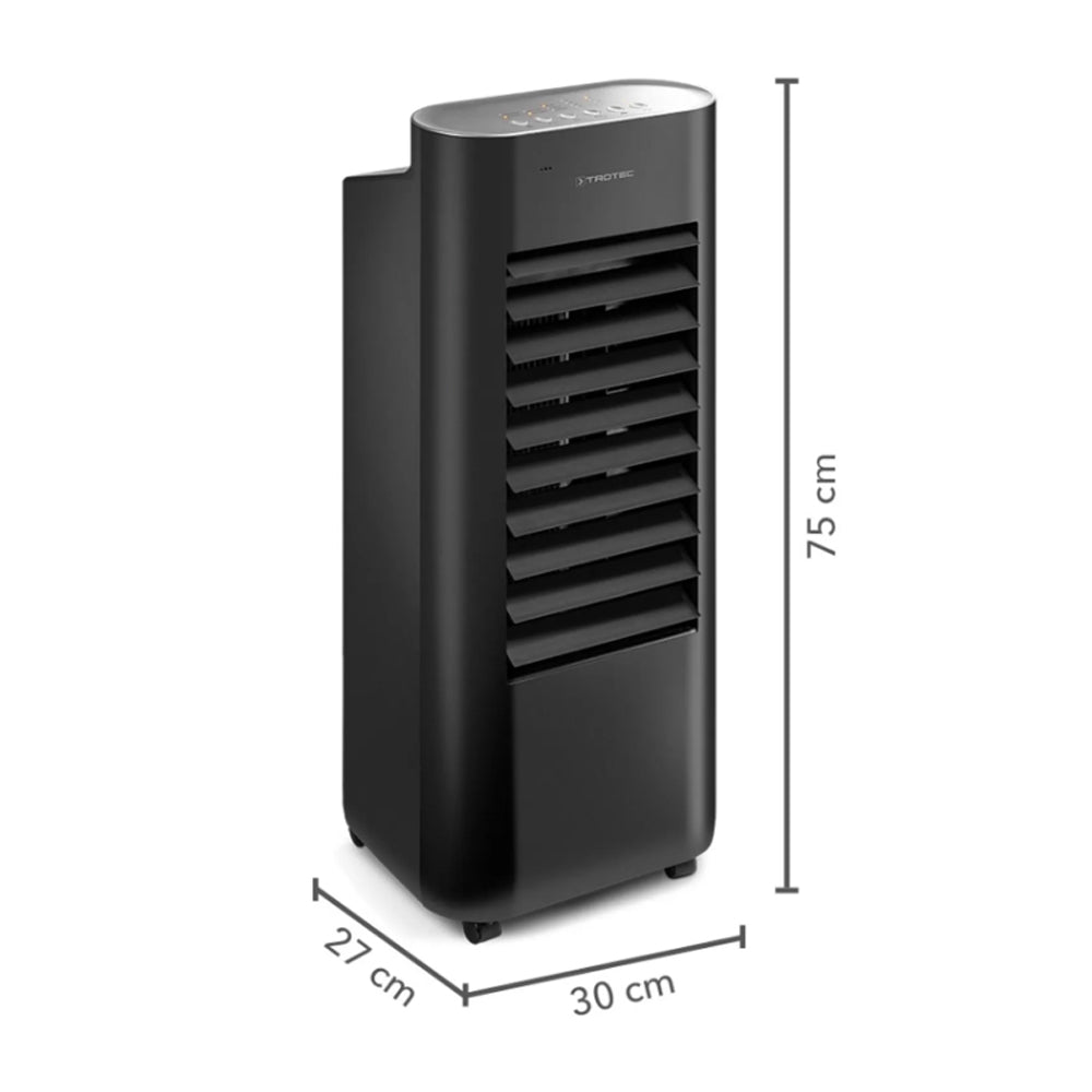 Mobilus oro vėsintuvas Trotec PAE 22 suteikia galimybę mėgautis natūralia vėsa ir gaiva jūsų namuose. Šis vėsintuvas greitai ir efektyviai atvėsina patalpas iki 24 m² arba 60 m³ dydžio, todėl puikiai tinka naudoti miegamajame, svetainėje, vaiko kambaryje ar bet kurioje kitoje patalpoje. Skirtingai nei oro kondicionieriai, šis vėsintuvas nereikalauja aušinimo skysčio – tiesiog pripildykite jį vėsaus vandens. Norėdami pasiekti itin šaltą oro srovę, į vandenį galite pridėti atvėsintus ledo paketus (pridedama komplekte) arba ledo kubelius. Kompaktiškas vėsintuvo dydis ir integruoti ratukai bei rankena leidžia lengvai perkelti įrenginį į kitą vietą. Stilingas juodos spalvos dizainas derės bet kuriame namų interjere. Be to, šiam oro vėsintuvui nereikia išmetimo žarnos, kuri dažnai reikalinga mobiliose oro kondicionavimo sistemose.