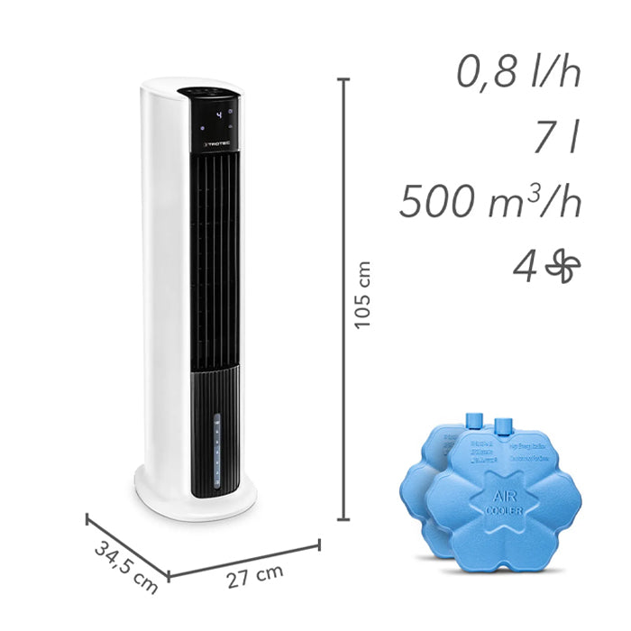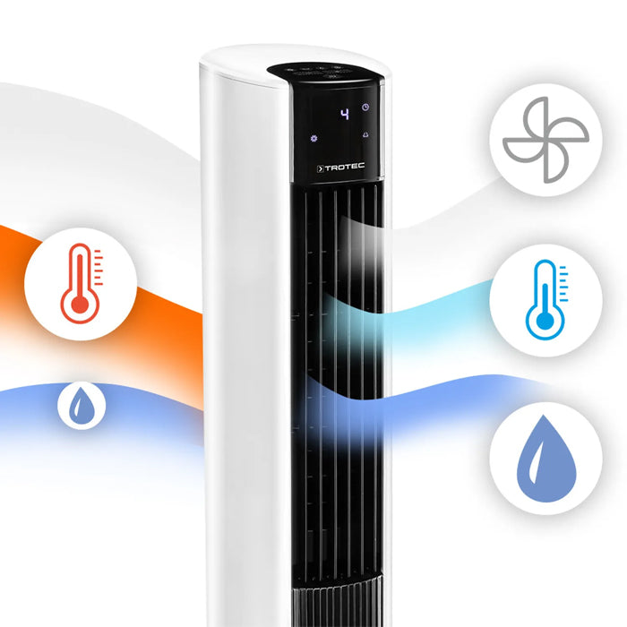 Mobilus oro vėsintuvas Trotec PAE 30 yra stilingas ir funkcionalus bokštinis prietaisas, skirtas vėsinti, drėkinti ir valyti patalpų orą ištisus metus. Šis prietaisas užtikrina malonų vėsų vėjelį ir švarų, gaivų orą, todėl puikiai tinka tiek namuose, tiek biure. Su 7 litrų vandens talpa, stipriu 500 m³/h oro srautu ir 0,8 litro per valandą drėkinimo našumu, Trotec PAE 30 gali efektyviai vėsinti iki 50 m² arba 125 m³ dydžio patalpas daugiau nei 8 valandas su vienu vandens bakelio pripildymu.