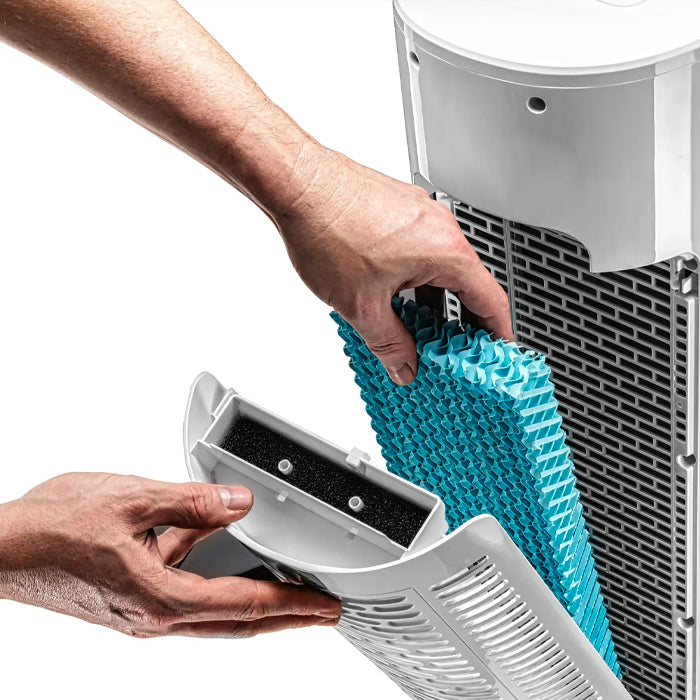 Vėsintuvas turi integruotą medaus korio struktūros garinimo filtrą, kuris valo, drėkina ir vėsina orą, pašalindamas gyvūnų plaukelius, pūkus ir dulkes. Visas funkcijas ir nustatymus galima patogiai valdyti nuotolinio valdymo pulteliu.