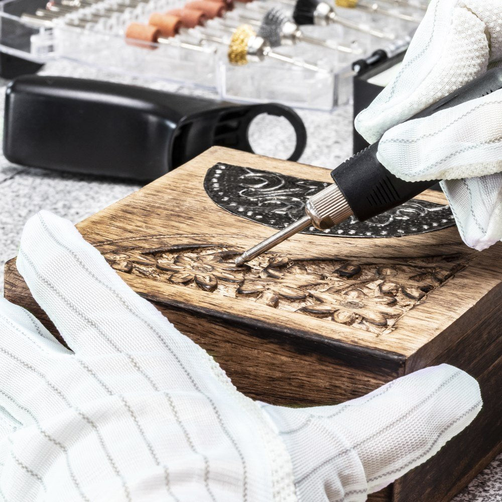 - metalo, plastiko, stiklo, keramikos, medienos, odos graviravimui ir poliravimui.