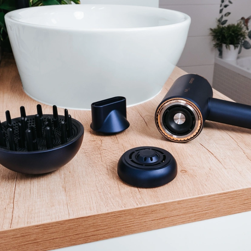 Įrenginyje integruotas aukštos spartos BLDC motoras, pasiekiantis iki 110 000 aps./min., leidžia plaukus išdžiovinti greitai ir efektyviai, išlaikant žemą temperatūrą. Tai sumažina karščio poveikį plaukams ir padeda išsaugoti jų natūralų žvilgesį. Džiovintuvas taip pat turi tris magnetinius antgalius – didelį difuzorių, plaukų formavimo koncentratorių ir aliejinės terapijos antgalį, kurie lengvai ir saugiai tvirtinami. Greitas keitimo mechanizmas leidžia lengvai pereiti nuo džiovinimo prie modeliuojančio oro srauto.