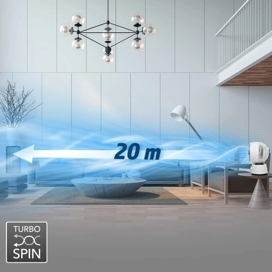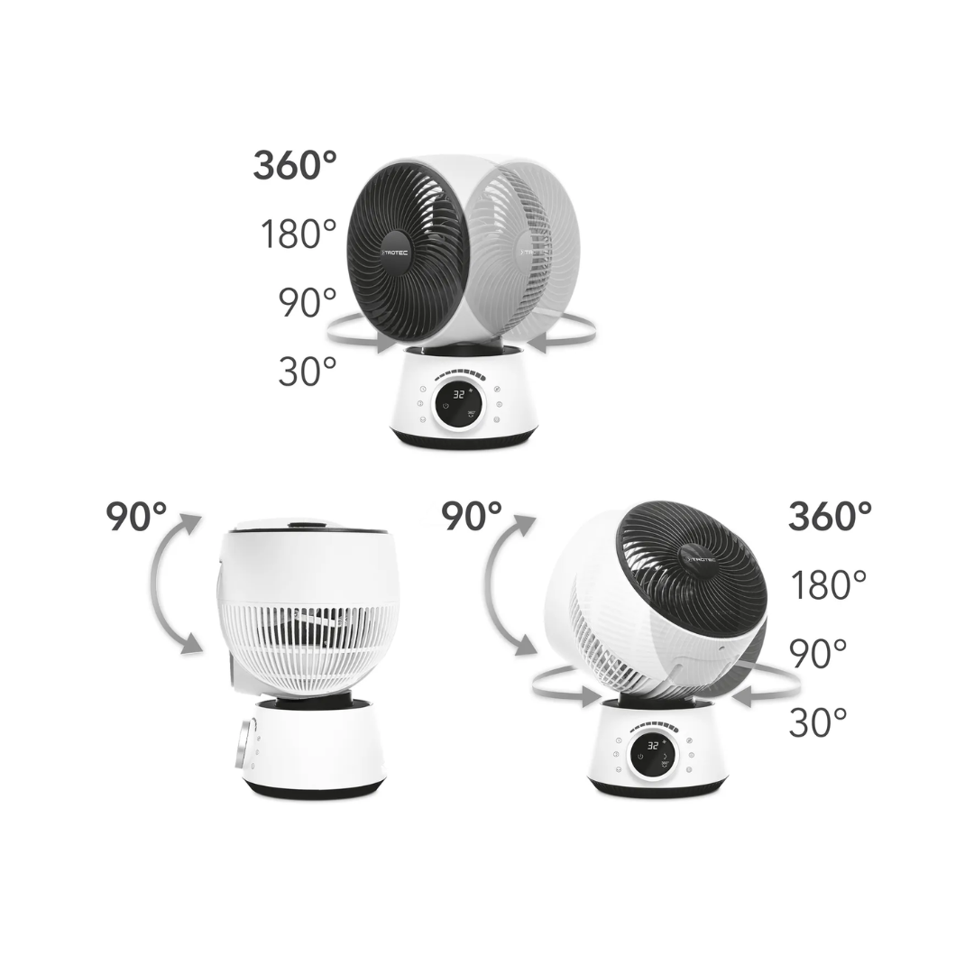 Stilingas ir itin kompaktiškas ventiliatorius Trotec TVE 100 suteikia 360° turbo vėsą jūsų namuose, ofise ar bet kurioje kitoje reikiamoje vietoje. Dėl integruotos TURBO SPIN technologijos ir 26W galios variklio, šis ventiliatorius greitai ir efektyviai atvėsins patalpą. Reguliuojamas 360° pasvirimo kampas ir 32 galimi vėjelio lygiai užtikrina iki 1200 m³/h oro srauto greitį. Naujoviška pasukimo ir pakreipimo konstrukcija su 30°, 90°, 180° ir 360° pakopomis bei 90° pasukimo funkcija leidžia individualiai paskirstyti orą visoje patalpoje. Ventiliatorius veikia tyliai – vos 56 dB 1 metro atstumu. Jį galima valdyti per valdymo skydelį sukamuoju jungikliu arba su nuotolinio valdymo pulteliu, kuris įeina į komplektaciją. Papildomą malonumą suteikia aromaterapijos funkcija – kvapiųjų aliejų difuzorius paverčia kelis lašus eterinio aliejaus į malonų kvapų rūką, kuris nepastebimai pasklinda po visą kambarį.